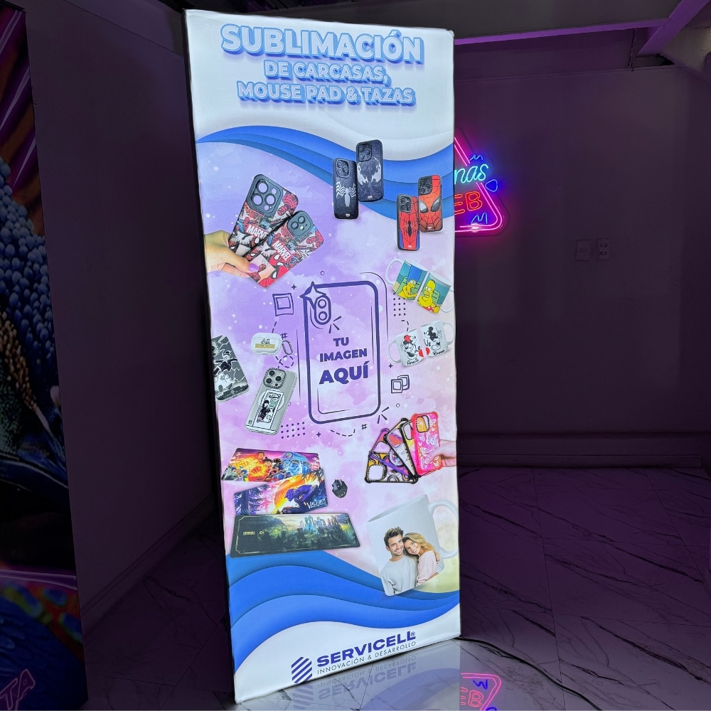 El formato 80×200 cm entrega presencia y lectura ideal en pasillos y vitrinas. También fabricamos a medida.Haz que tu mensaje brille